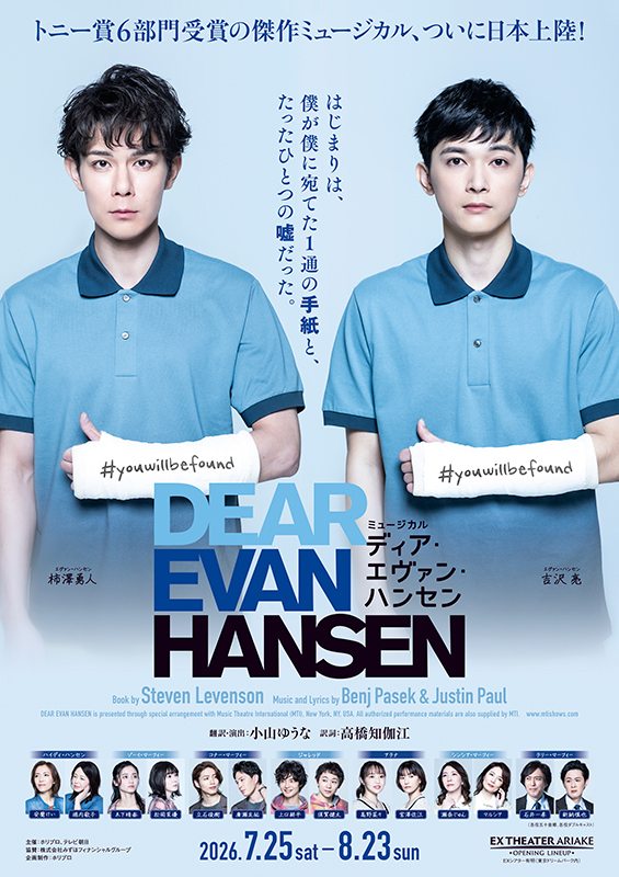 トニー賞を受賞した大ヒットブロードウェイミュージカルがついに日本初演。翻訳・演出の小山ゆうなさんは、「日常を描いたささやかな作品なので大劇場でどうなるかな?と思っていましたが、舞台上から見ると客席最後列が遠く感じない。お客様のことをよく考えてくださっている劇場だと思います。また音響へのこだわりが色々あるという点も嬉しい」と楽しみな様子。既に一度本読みが行われたそうで、「私が翻訳をしていることもあり、皆さんの声を通して台詞を聞いてみたくて、集まれる方はぜひとお声がけしました。するとキャストほぼ全員が集まり、皆さんそれぞれに熱い思いののった状態で読んでくださいました。主人公エヴァン役には1幕を吉沢亮さん、2幕は柿澤勇人さん。冒頭エヴァンの台詞から始まるのですが、吉沢さんはとても繊細だけれども実のあるアプローチで第一声から驚きました。一方、柿澤さんは力強く相手役を動かす説得力のあるエヴァン。お二人とも全く違うエヴァンになりそうです」と力を込めました。福田雄一さんはSNSで「これは絶対観なければ!」と投稿したほどの『ディア・エヴァン・ハンセン』ファン。「ブロードウェイ開幕1週間後くらいに、家族で観に行きました。大好きなミュージカルだったので、日本ではいつ誰がやるんだろう?と思っていたら、最高のキャストでの上演が決まって。亮くんもカッキーも仲良くさせていただいているので、ぜひ家族で観に行きたい」と期待を寄せました。